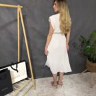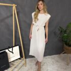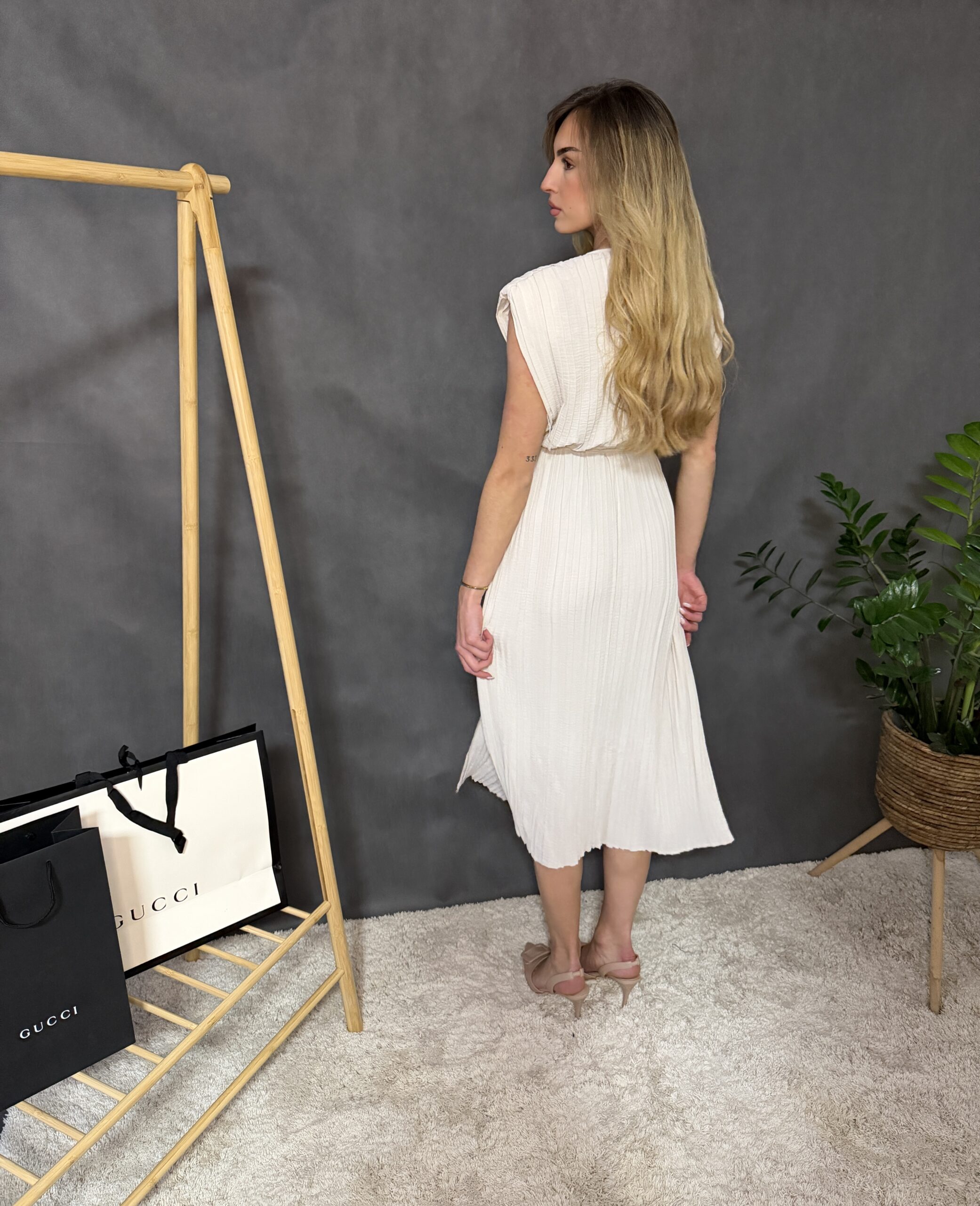 Šaty v midi dĺžke skladané s jemným opaskom. Šaty sú elastické a mjr vypchávky na pleciach.